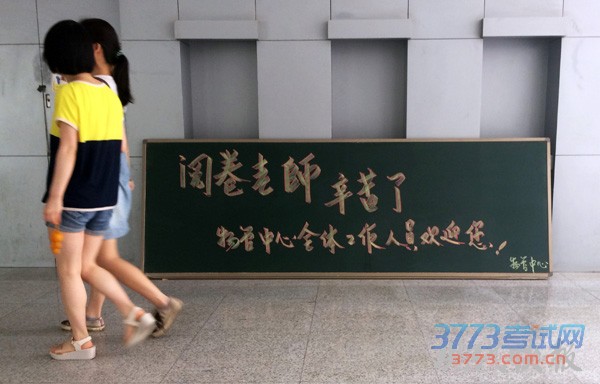 走进综合楼大厅,门口的落地黑板上写着欢迎标语:“阅卷老师,辛苦了”,在大楼转弯处,摆放着“阅卷点由此向前”的标志牌。现代快报记者