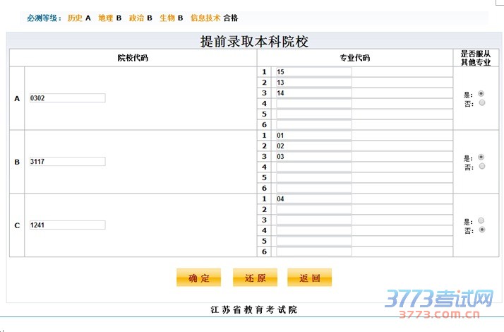 8、点击考生所要填报的批次进入“志愿填报界面”,输入考生所要填报院校和专业的代码,院校代码为4位,专业代码为2位,如服从该院校其他专业,请在“是否服从其他专业”后打上标志。填报完成后点击“确定”按钮,如需要重新填写点击“重填”按钮清空代码,如需要回到上一个界面点击“返回”按钮。