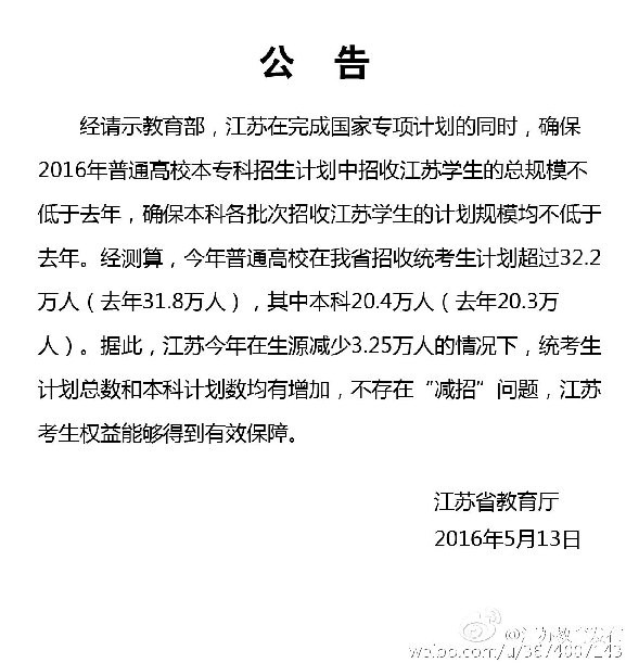 相关文章 教育部2016年普通高校招生计划有关情况答记者问江苏高考减招?江苏省教育厅发布公告称不存在江苏教育厅回应高考减招问题:不存在湖北江苏高考减招?官方回应实际录取人数提高江苏省教育厅:确保2016高考招生人数不低于去年2016江苏中职注册入学时间安排2016江苏对口单招成绩查询系统入口2016江苏对口单招本科专科分数线2016江苏对口单招录取分数线(本科专科)2016江苏对口单招查分及录取分数线公布 触屏版 电脑版 3773考试网 琼ICP备12003406号-1