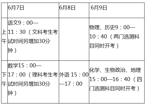 我省全国统考科目、学业水平测试选测科目考试时间为6月7、8、9日。