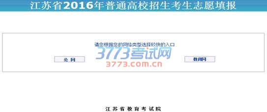 1、打开填报网址(http://gkzy.jseea.cn),进入“江苏省2016年普通高校招生考生志愿填报”界面首页。根据自己的网络条件,选择合适的入口。如果不知道自己的网络类型,可以将“公网”、“教育网”按钮都点击尝试一下,选择速度较快的入口: