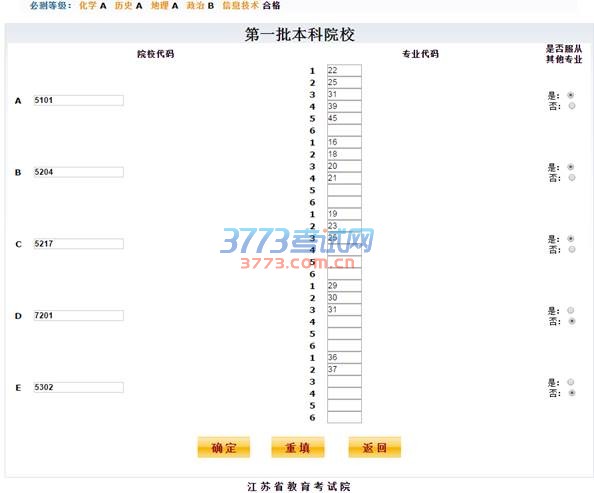 8、点击考生所要填报的批次进入“志愿填报界面”,输入考生所要填报院校和专业的代码,院校代码为4位,专业代码为2位,如服从该院校其他专业,请在“是否服从其他专业”后打上标志。填报完成后点击“确定”按钮,如需要重新填写点击“重填”按钮清空代码,如需要回到上一个界面点击“返回”按钮。