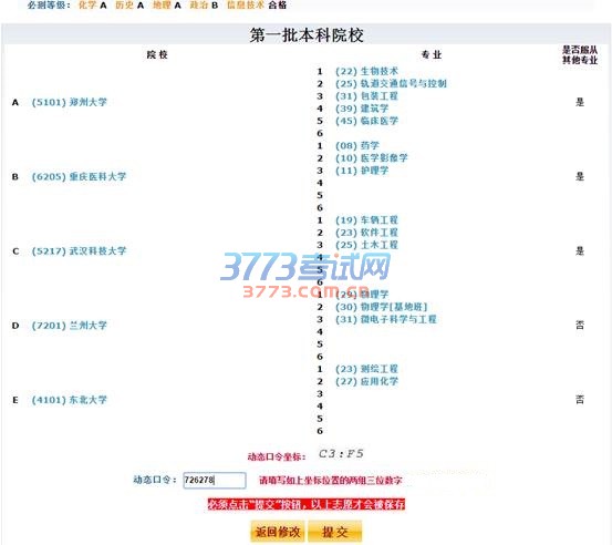 (3)然后根据页面上提示的位置,输入口令卡上相应的密码726278(如下图所示),即可完成志愿信息提交,每次修改、删除志愿时,也需要输入动态口令方能完成志愿的修改或删除。