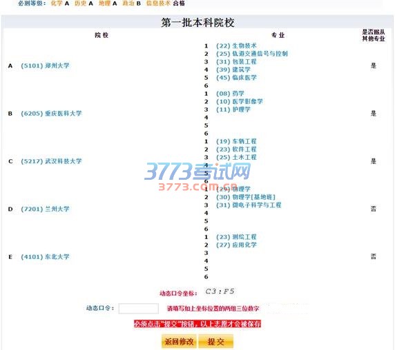 11、填报志愿时,在每次填报完成后提交志愿信息时,请根据页面上显示的位置,刮开本人动态口令卡背面密码区域对应位置。例如,页面提示请输入C3:F5位置的密码(如下图所示)