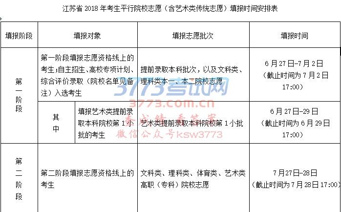 江苏省2018年考生平行院校志愿(含艺术类传统志愿)填报时间安排表