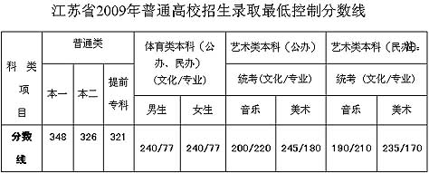 扬州网讯(本网记者 徐小燕)今天下午4点,江苏省教育厅将召开新闻发布会公布2009年高考本一、本二省控线及第一阶段填报志愿的资格线。普通类本一为348分,本二326分,提前专科321分。体育类本科(公办、民办)240分(文化)/77分(专业)。艺术类本科(公办):音乐类200分(文化)/220分(专业),美术类245分(文化)/180分(专业);艺术类本科(民办):音乐类190分(文化)/210分(专业),美术类235分(文化)/170分(专业)。