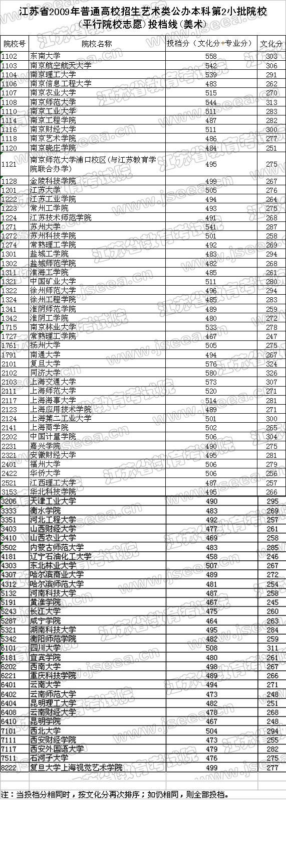 该小批实行平行志愿的设置办法,其中美术类专业对文化分和专业分均达省控线(文化245分,专业180分)的考生,按院校提出的调档比例(不超过1:1.2),按照文化分和专业分之和进行排序投档。当文化分和专业分之和相同时,按考生的文化分再次排序投档。