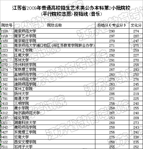 投档情况显示,该小批院校平行志愿已全部投档满额,其中美术类专业投档线(文化分+专业分)较高的如:东南大学558分,复旦大学576分,同济大学580分,上海交通大学573分。音乐类专业投档线(专业分)较高的如:南京艺术学院297分,南京师范大学290分,江南大学292分,苏州大学291分,扬州大学286分。