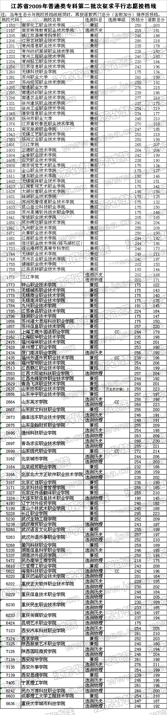 [图文]2009年江苏高考专科第二批次征求平行志愿投档线