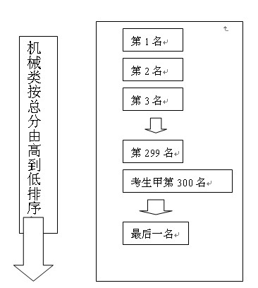 第一步,分科目组先对考生按总分从高到低排序,分数高的考生先检索投档。比如某机械科目组考生甲成绩排在全省机械科目组考生的第300名,需要前面299人检索处理完成后,才轮到这位考生(如下图所示)。
