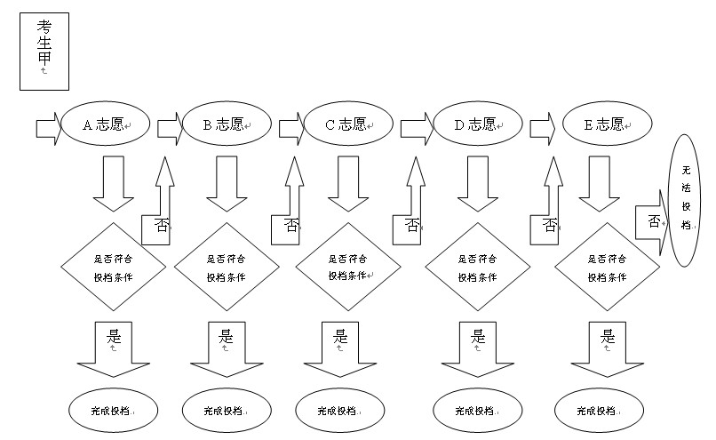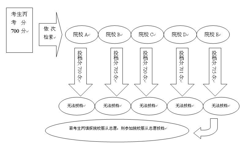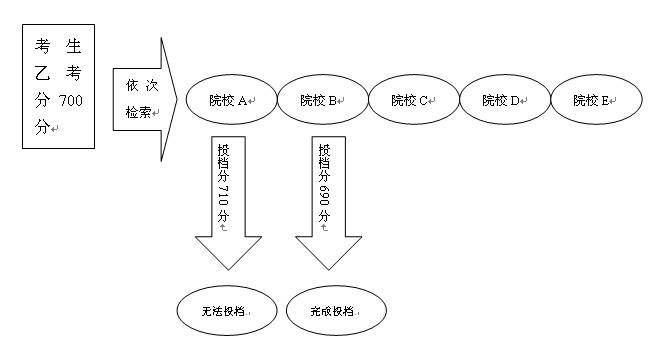举例一,机械科目组考生乙,考分700分。机械科目组投档,计算机检索到该生时,首先检索该生填报的A院校,假设A院校计划已投满,且投档最低分为710分,该生不符合投档条件,无法投往该校;则继续检索B院校,假设B院校计划未投满,则该生档案投往B院校,计算机不再检索C、D、E志愿。依此类推(如下图所示)。