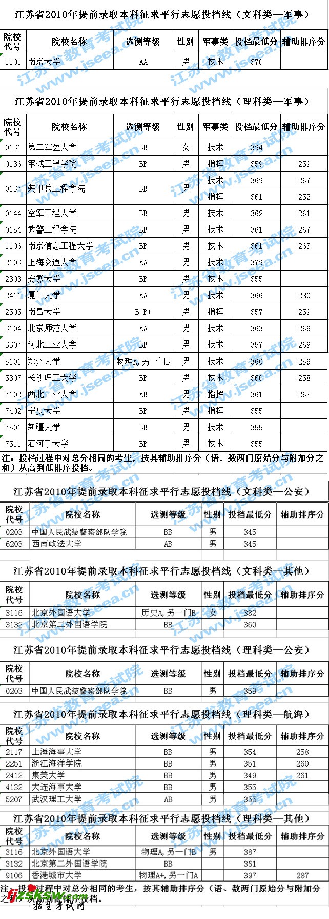 [图文]江苏省2010年提前批本科征求平行志愿投档线(含军校、公安、航海)
