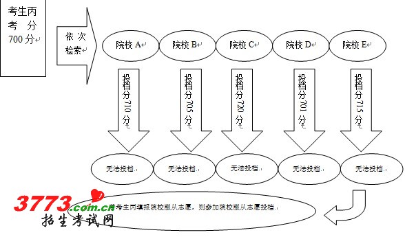举例二,机械科目组考生丙,考分700分。机械科目组投档,计算机检索到该生时,如果该生填报的5所院校计划均已在701分以上投满,则该生的5所院校均无法投档,若该生填报院校服从志愿,则参加院校服从志愿投档。(如下图所示)。