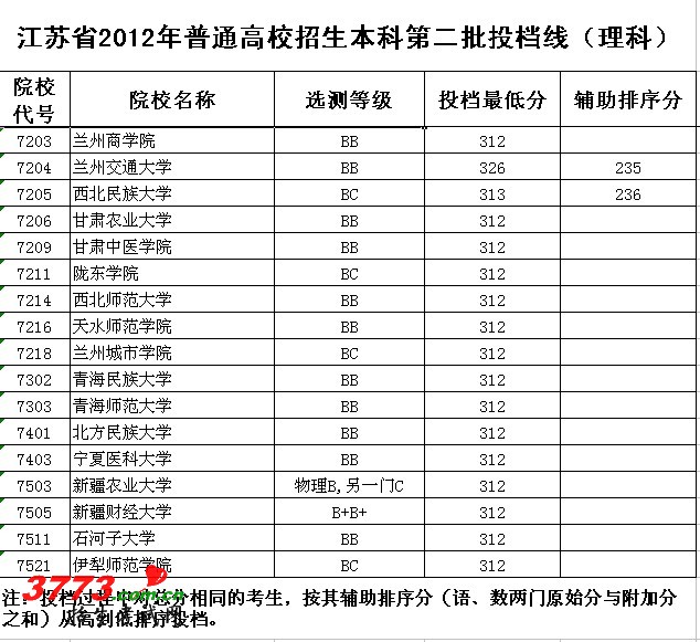 [组图]2012年江苏高考本科第二批投档分数线(理科)