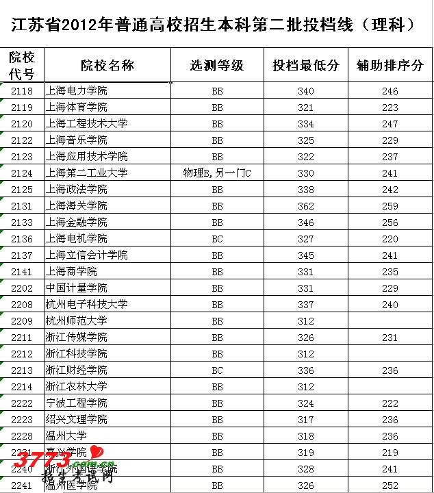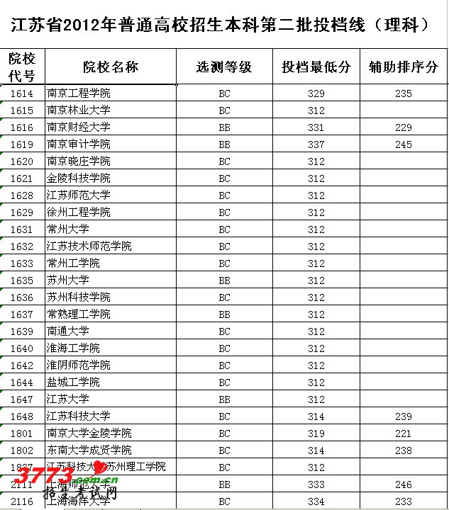 [组图]2012年江苏高考本科第二批投档分数线(理科)