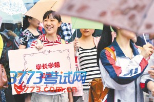 图为在南京市第九中学考点门前,一名学生举着标语牌为参加高考的学长学姐加油。本报记者万程鹏摄