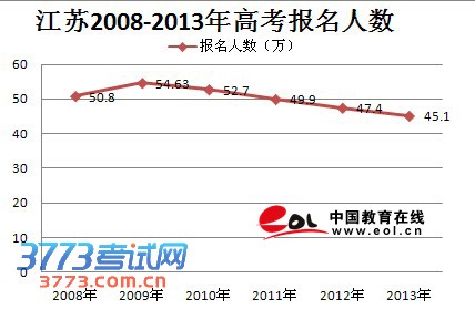 3773考试网数据显示,江苏2013年高考共有45.1万考生参加,相比于去年的47.4万人,再次减少2.3万人,同比下降5.2%。江苏2008-2012年高考报名人数依次为,2008年,江苏高考50.8万人报名;2009年,江苏高考报考人数为54.63万人;2010年,江苏高考报考人数降至52.7万人,比2009年减少约1.9万人;2011年,江苏高考报考人数继续下降至49.9万余人,较2010年减少2.8万人;2012年,江苏高考报考人数仅仅47.4万人。