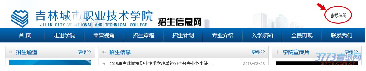 2.进入招生录取子网站(http://zhaosheng.jlcsxy.com/)如下图所示点击网站右上角的【会员注册】功能进行报考账号注册