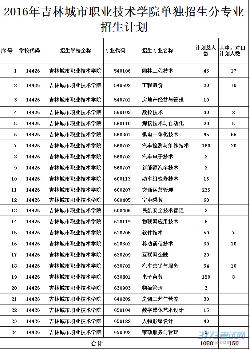 [图文]2016吉林城市职业技术学院单独招生分专业招生计划