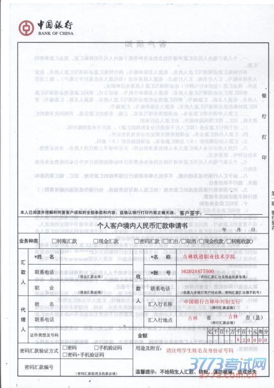附样表:(注:红色为必填内容,请在用途及附言栏中注明考生的姓名及身份证号)