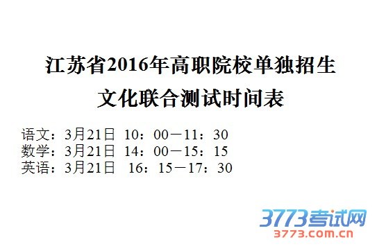 江苏省2016年高职院校单独招生文化联合测试时间表