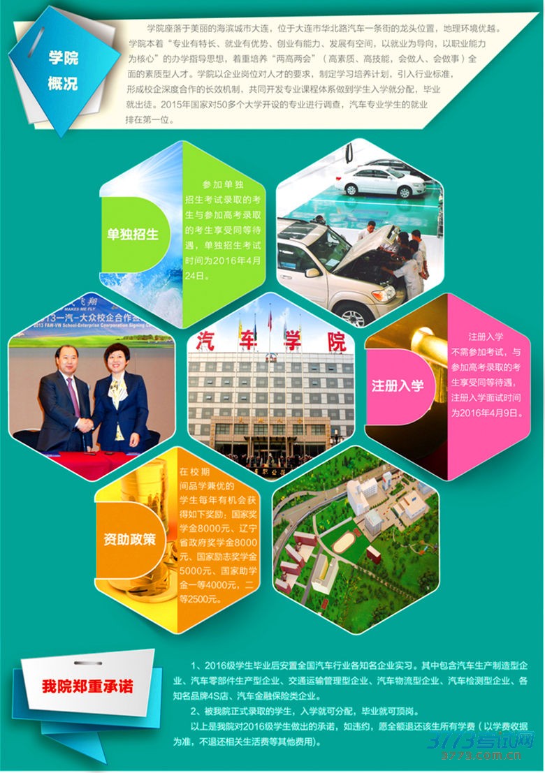 学院座落于美丽的海滨城市大连,位于大连市华北路汽车一条街的龙头位置,地理环境优越。学院本着“专业有特长、就业有优势、创业有能力、发展有空间,以就业为导向,以职业能力为核心”的办学指导思想,着重培养“两高两会”(高素质、高技能,会做人、会做事)全面的素质型人才。学院以企业岗位对人才的要求,制定学习培养计划,引入行业标准,形成校企深度合作的长效机制,共同开发专业课程体系做到学生入学就分配,毕业就出徒。2015年国家对50多个大学开设的专业进行调查,汽车专业学生的就业排在第一位。