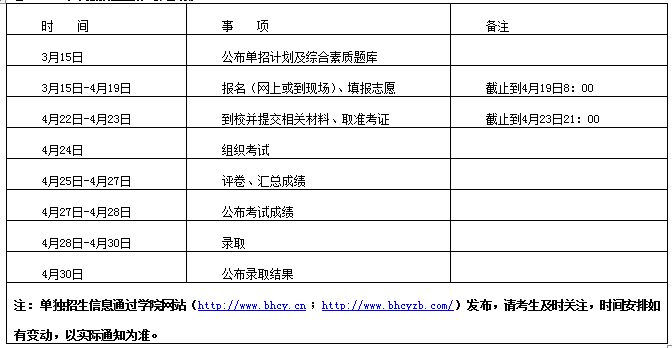 三、志愿结构及相关要求每个考生只允许报考一个与中职所学专业相同或相近的专业志愿。四、命题及考试1.命题:在教育部和辽宁省的考试大纲范围内,根据高职院校特点和学校实际制定单独招生考试大纲,参照高考命题的各项要求,命题、试卷印刷工作按照国家和省相关保密规定要求执行。2.考试科目: 综合素质加试、专业技能。“综合素质加试”考试方式为笔试,满分为100分;“专业技能”考试方式为实际操作,满分200分。总分满分为300分。试题题库和专业大纲在网上公布(网址为http://www.bhcyzb.com),题库公布时间为3月15日。3.考试时间安排: