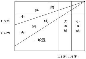 (1)测试方法:由主考指定二传手在3号位传球,考生在4号位自己给一传后助跑起跳扣球。每个考生连续扣3次直线,再连续扣3次斜线,共扣球6次。(示意图)