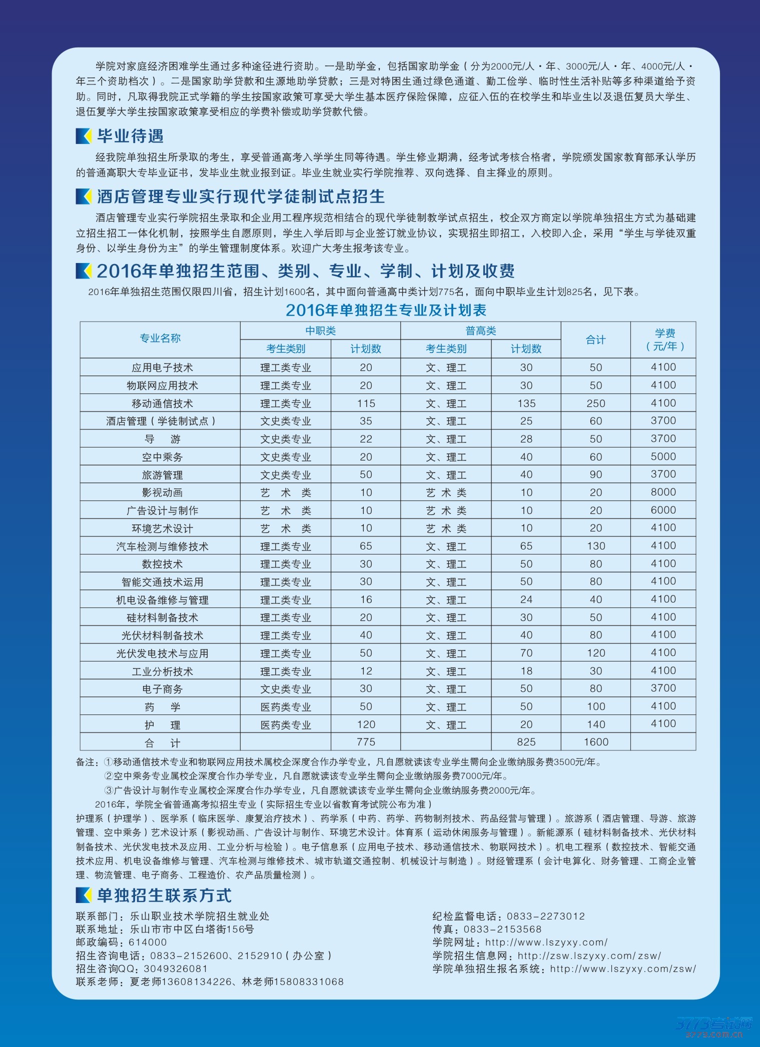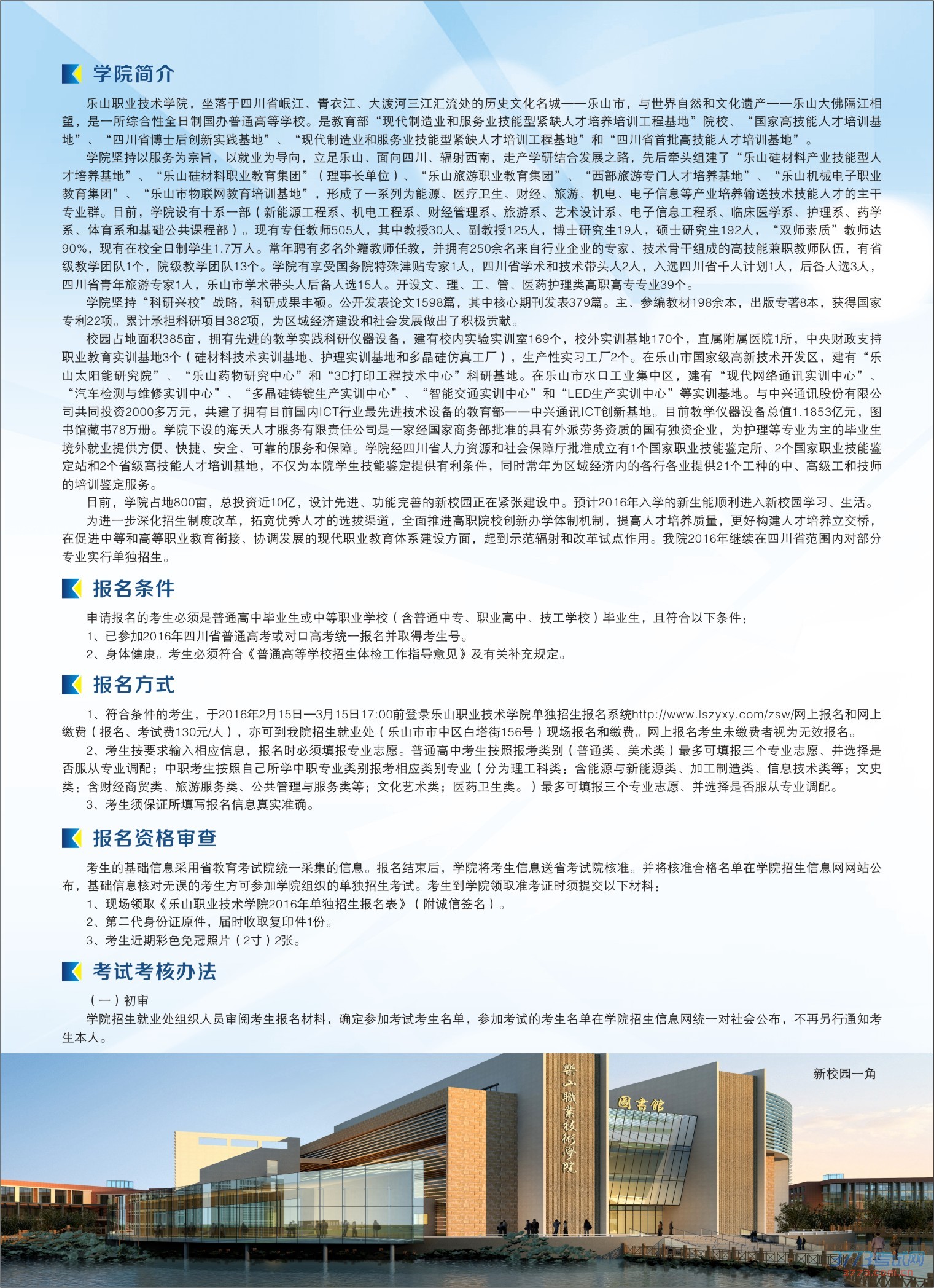 相关文章 乐山职业技术学院2015年单独招生简章2014乐山职业技术学院录取查询方式入口乐山职业技术学院2014年招生简章乐山职业技术学院2014年单独招生免试及加分方案乐山职业技术学院2014年单独招生专业及计划乐山职业技术学院2014年单招时间安排乐山职业技术学院2014年单独招生简章乐山职业技术学院2014年单独招生方案乐山职业技术学院2014年单独招生章程乐山职业技术学院录取分数线 触屏版 电脑版 3773考试网 琼ICP备12003406号-1