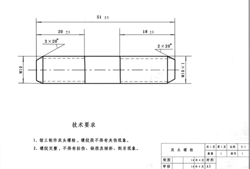 注:图2为手工制作双头螺栓的参考图纸,图纸上的尺寸仅为以往考试的样例,只作为参考尺寸,见图2。
