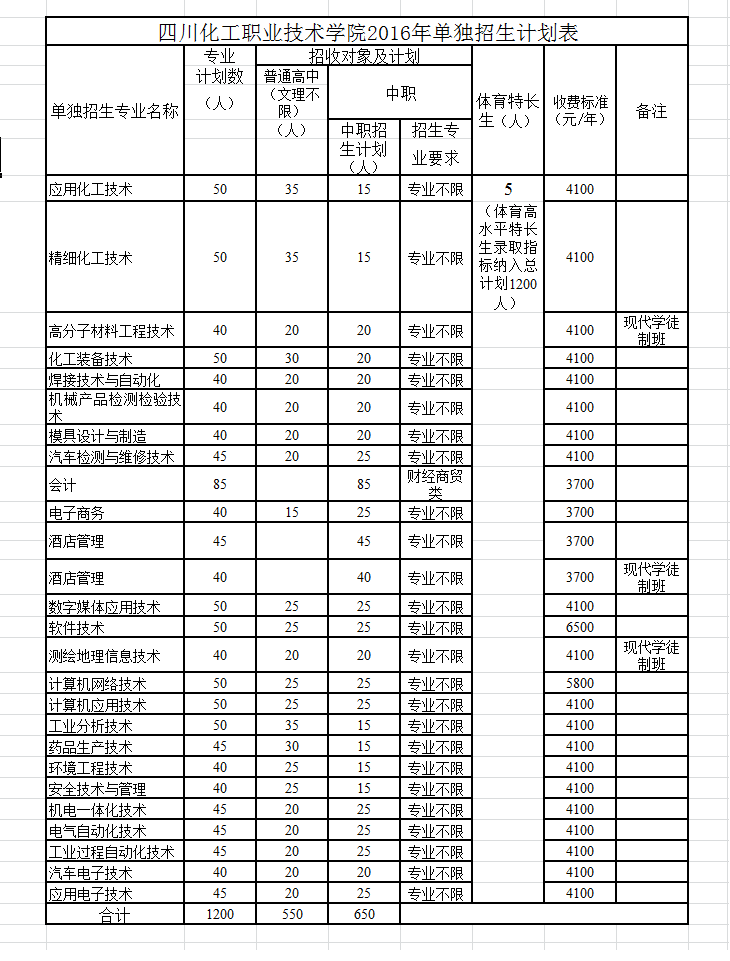 学院2016年单独招生计划为1200人,其中中职类招生计划650人(其中“现代学徒制定向班”80人),普通类招生计划550人(其中“现代学徒制定向班”40人)。