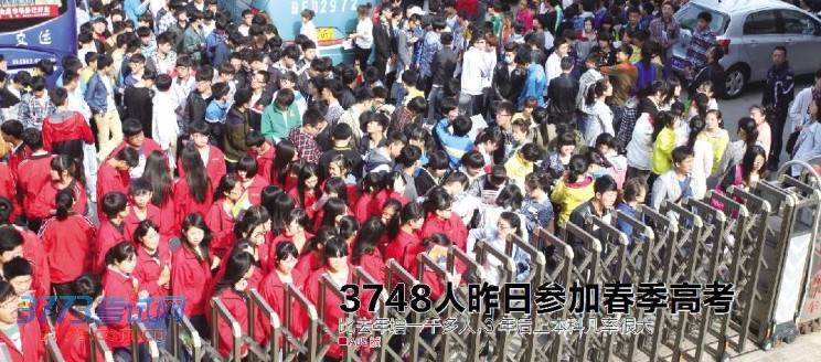 水母网5月11日讯 昨日,2014年春季高考在我市4个考点举行,港城3748人报名参加考试,考生数量较去年增加近一 半。记者从此前省教育厅公布的消息获悉,今年全省春季高考本科招生计划再次翻番,增加到10460人,初步计算,将有超过10%的考生获得升本机会。