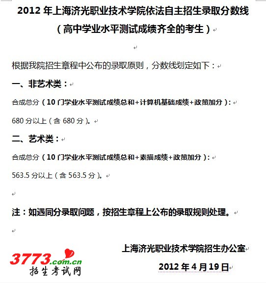 [图文]2012年上海济光职业技术学院依法自主招生录取分数线