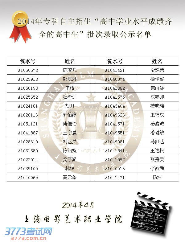 上海电影艺术学院2014年专科自主招生“高中学业水平成绩齐全的高中生”批次录取公示名单