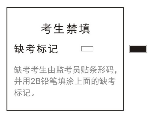 严禁考生本人填涂缺考标记。如有考生缺考,由监考员用0.5mm蓝色字迹签字笔填写正面手写区的姓名、准考证号、座位号和背面卡头手写区的姓名、座位号,并在缺考标记区用2B铅笔涂黑缺考标记。