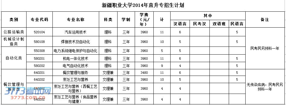 新疆职业大学2014年优秀中职毕业生直升高职(专科)招生的总计划为75人,专业大类及专业计划如下表: