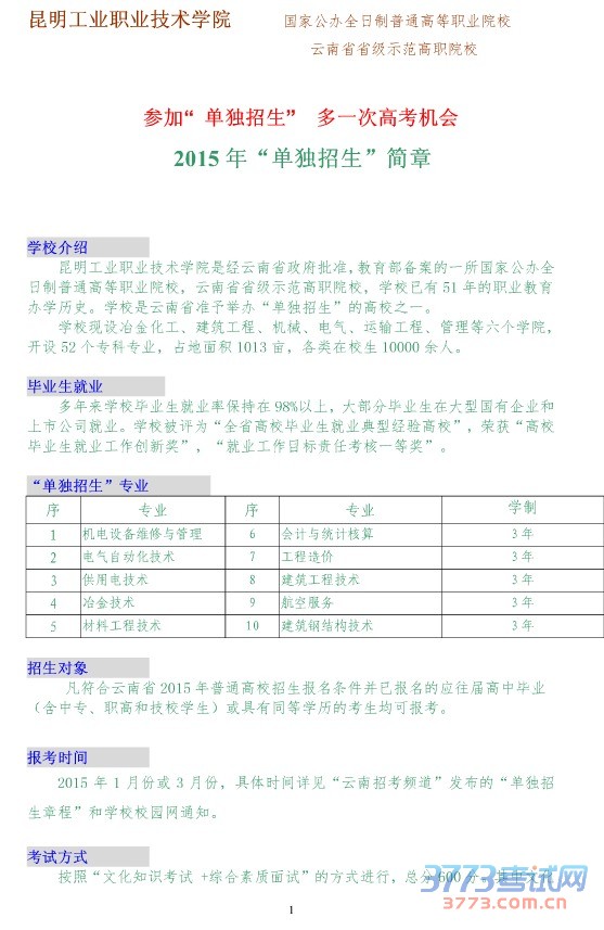 [组图]昆明工业职业技术学院2015年单独招生简章