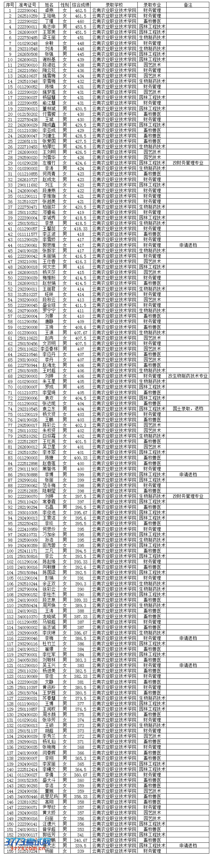 [图文]云南农业职业技术学院2013年单独招生预录取名单