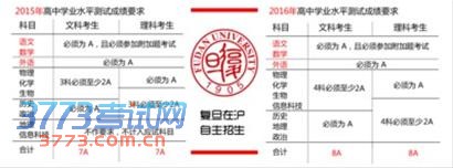 而到了2016年,复旦大学将在上海市的自主选拔录取改革试验中,全面使用学业水平考试成绩作为考生的报考资格,具体要求报考考生:1)学业水平考试的10门科目(9门笔试科目+信息科技)中不少于8门科目等第为A(具体视2014年学业水平考试情况而定);2)其中,语文、数学和外语科目等第必须为A;3)文科考生的政治、历史和地理科目等第必须为A,理科考生的物理、化学和生物科目等第必须为A;4)考生还必须参加语文和数学两门科目的附加题考试,且成绩达到一定要求(具体要求待考试方案确定后公布)。