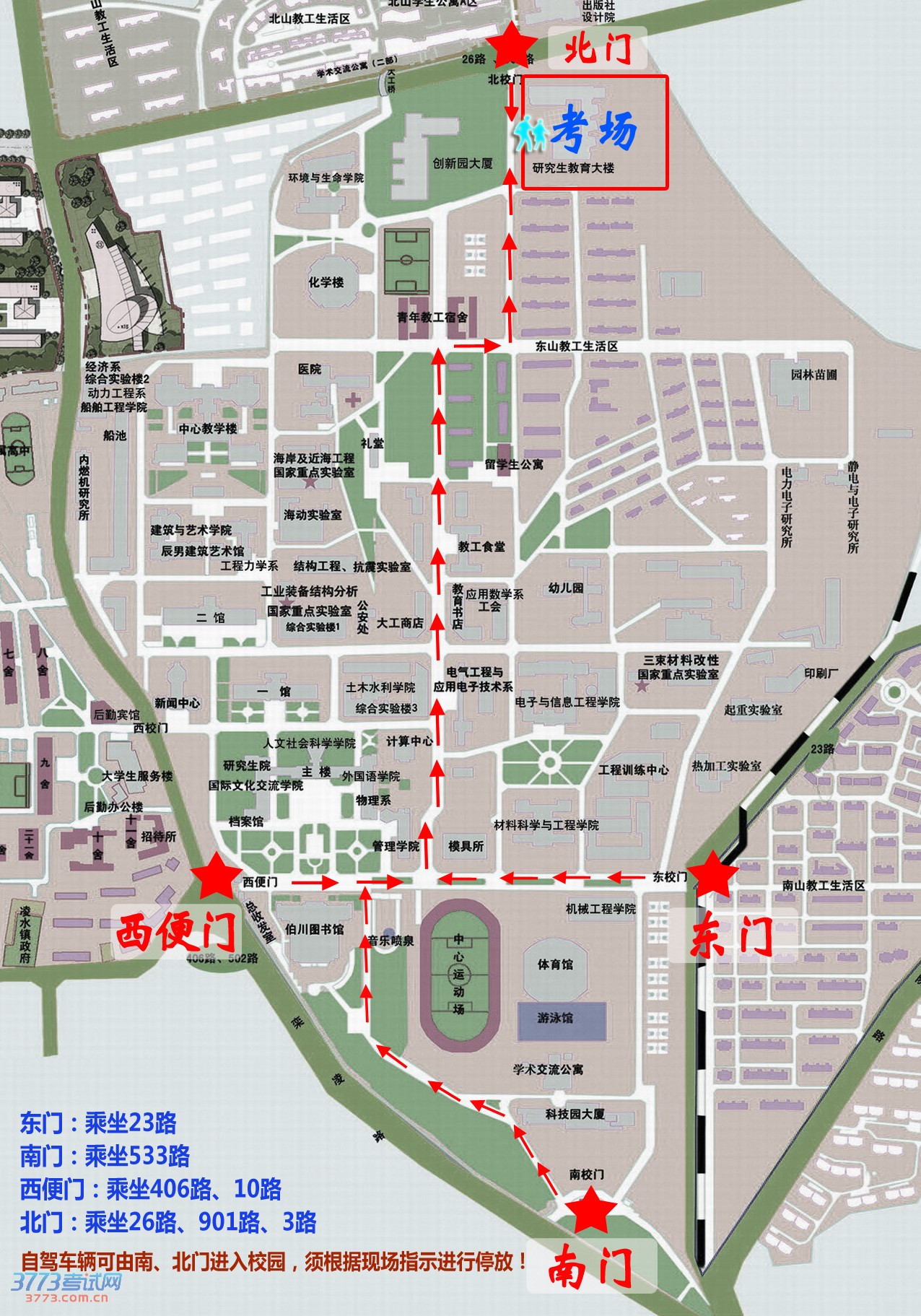 3、自驾车辆的考生及家长进入校园后请遵照工作人员指示通行和停车,进入校园后请不要鸣笛。