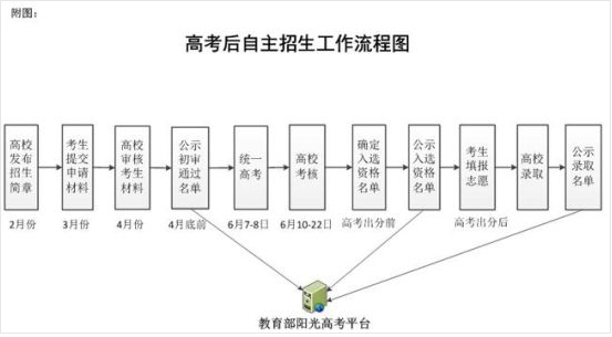 2月底前,试点高校发布年度自主招生简章。3月底前,考生完成报名申请。4月底前,高校完成考生材料审核,确定参加学校考核考生名单并进行公示。