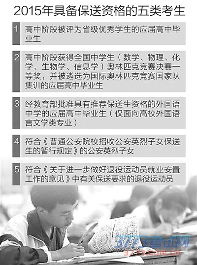 本报北京2月2日电 (记者赵婀娜)教育部日前下发《关于做好2015年高校部分特殊类型招生工作的通知》,其中规定,经批准开展综合评价招生试点的省份和高校,要进一步明晰试点定位,主要探索基于统一高考和高中学业水平考试成绩、参考综合素质评价的多元录取机制,不得采用自主招生办法招生。从2015年起,高校考核原则上安排在高考结束后、高考成绩公布前进行,高考前不得以任何形式开展与综合评价招生挂钩的考核活动。另据了解,2015年保送生招生类型与2014年保持一致,省级优秀学生、公安英烈子女等五类考生具备普通高校招生保送资格。