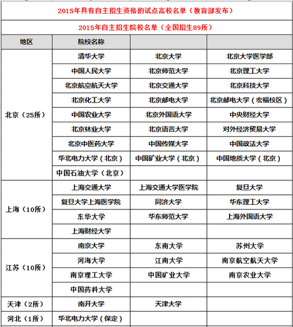 2015年共有102所试点高校具有自主招生资格。其中面向全国开展自主招生的高校有89所(含分校),面向本省开展自主招生的高校有13所。