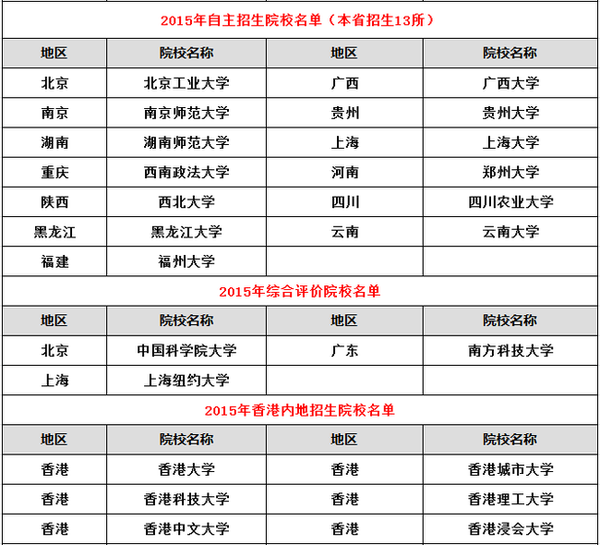 提醒广大考生和家长注意,已经临近2月底,各高校自主招生简章即将发布。届时考生和家长可及时关注教育部阳光高考信息平台、各高校本科招生网、各省市教育考试院、自主招生在线网站获取最新的自主招生资讯和政策。同时,本文特将2015年开展综合评价的院校名单以及开展内地招生的重点港校名单也一并进行汇总,方便广大考生和家长更有针对性查找信息资讯。