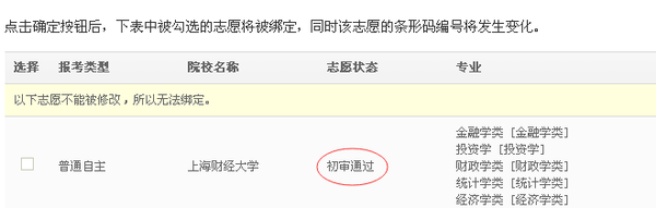 上海财经大学2015年自主招生计划已于3月27日报名结束。目前,有部分家长反映,在阳光高考自主招生报名平台中,上海财经大学2015年 自主招生初审结果查询中有“初审通过”的字眼出现。如图所示: