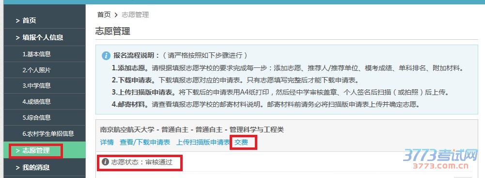 3、 志愿状态为审核通过的考生请点击”交费”链接,按照有关说明进行交费即可。