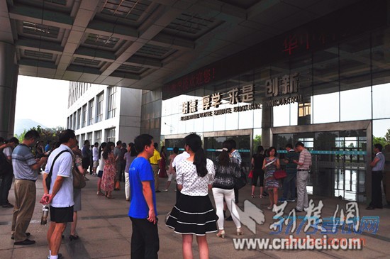 华中科技大学东九教学楼门口聚集着等待考生的家长们