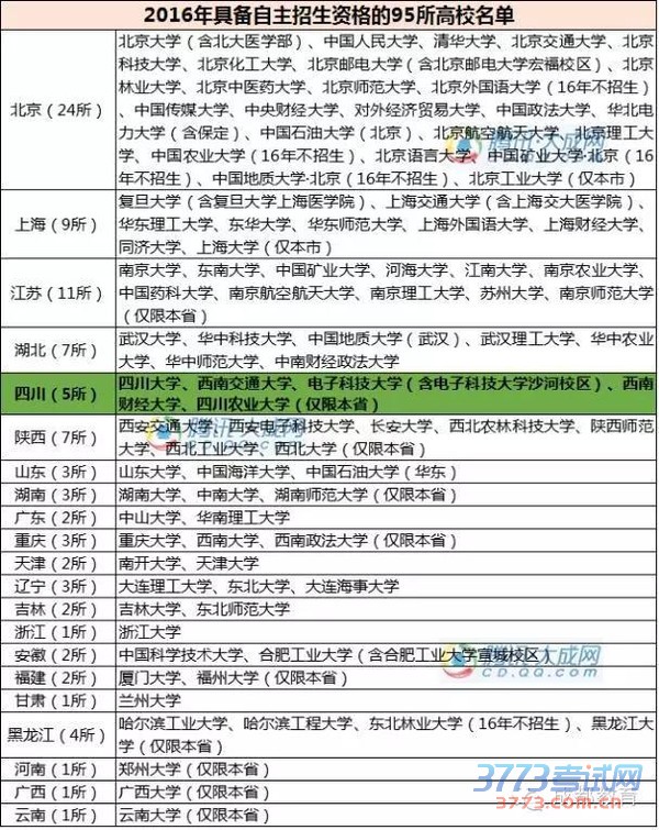 2016年高校自主招生工作陆续启动啦,很多考生家长都十分关注心仪高校是否具有自主招生资格。根据教育部最新消息:2016年全国共有95所具备普通自主招生招生资格的高校,其中,四川共5所,它们是四川大学、西南交通大学、电子科技大学(含电子科技大学沙河校区)、西南财经大学、四川农业大学(仅限本省),这5所都是川内的211学校,国家985工程学校有电子科技大学和四川大学这两所。如果有意愿参加这几所川内一流高校的自主招生的考生可要提前准备好啦!