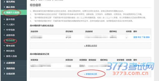 考生也可在志愿填报过程中,在“综合信息”栏中点击“添加获奖记录”,在生成的页面中填写并上传高中阶段发表论文等证明材料,如图2;