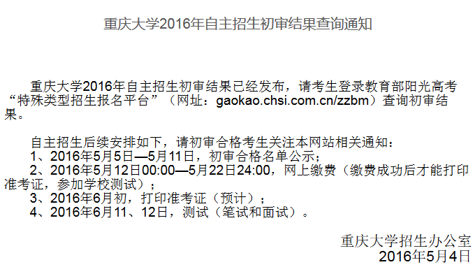 根据重庆大学2016年自主招生简章规定,重庆大学2016年自主招生初审结果已经公布,届时考生可通过重庆大学本科招生网和教育部“阳光高考”平台查询初审结果。